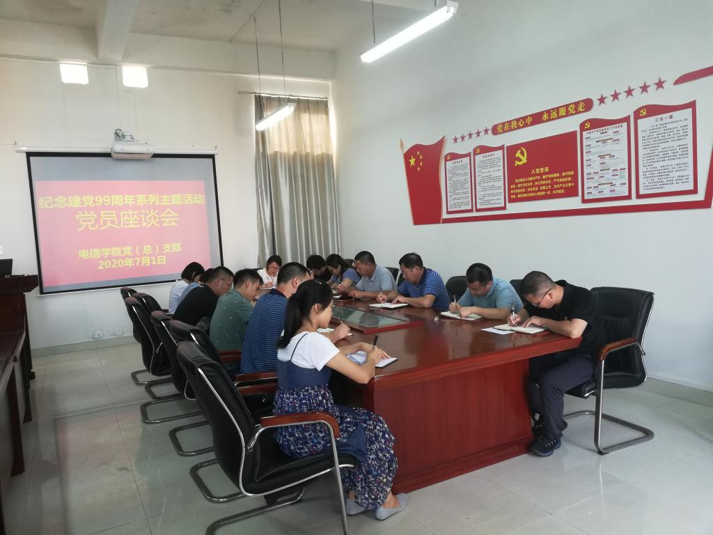 为庆祝中国共产党建党99周年,电信学院党(总)支部开展了系列纪念主题活动。7月1日,电信学院党(总)支部召开党员座谈会,学院党(总)支部委员及各党支部委员、教师党员代表参加了座谈会。座谈会由党(总)支副书记徐国辉同志主持。