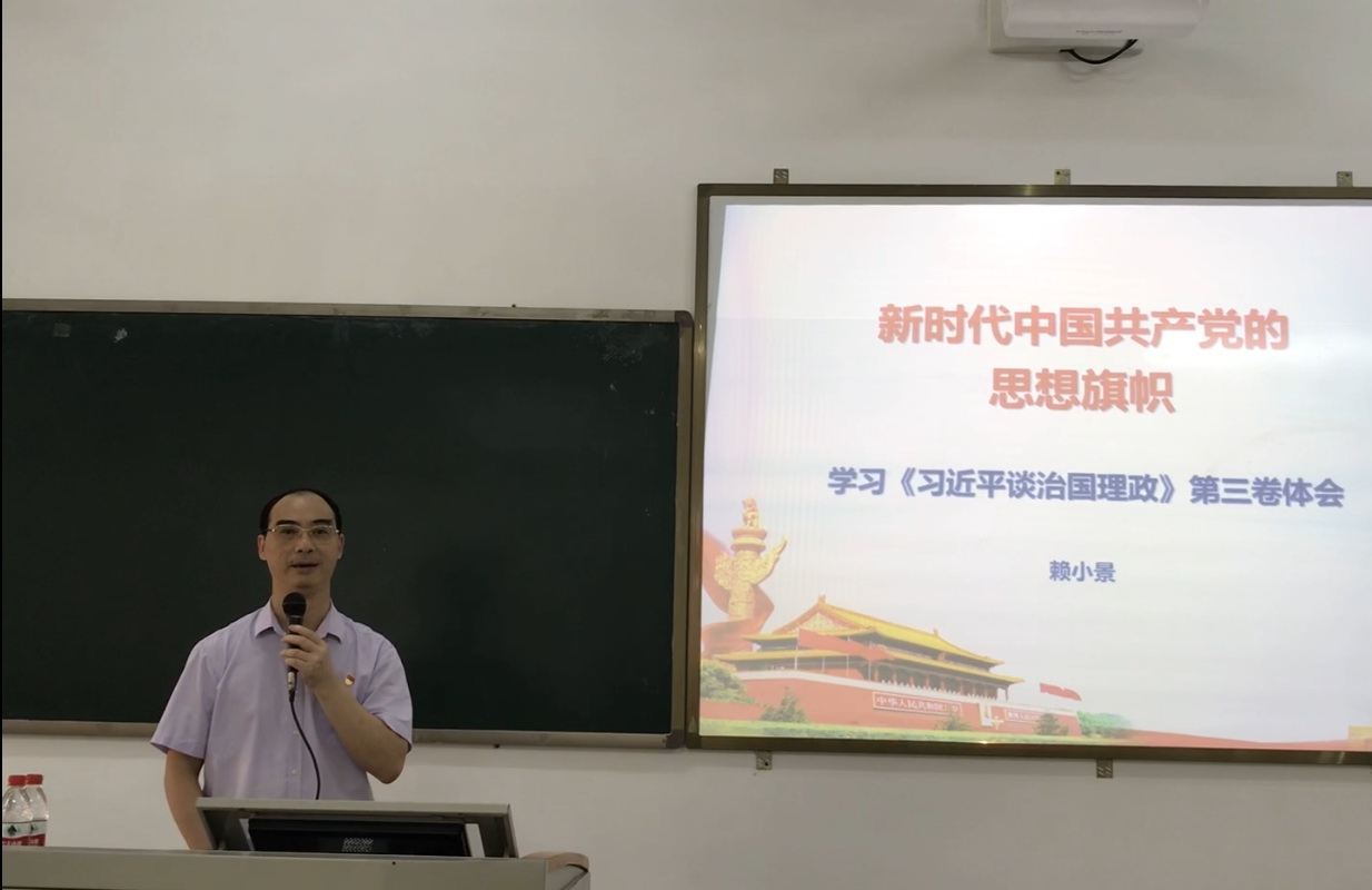 随后,赖小景副校长为作了题为《新时代中国共产党的思想旗帜——学习<习近平谈治国理政>第三卷体会》的辅导讲座,讲座内容分为三方面:一是《习近平谈治国理政》第三卷的重大意义,它是统一思想认识和行动的权威著作、马克思主义中国化的最新成果、推动治国理政新实践的行动指南、让世界读懂中国的“思想之窗”;二是《习近平谈治国理政》第三卷的基本概况,共92篇、十九个专题、五个板块,建议党员同志们学习《习近平谈治国理政》第三卷时要做到“一个坚持、三个结合”,要认真读原著、学原文、悟原理,要在多思多想、学深悟透上下功夫,要在系统全面、融会贯通上下功夫,要在知行合一、学以致用上下;三是重点解读习近平外交思想,从十个坚持、五个维度进行展开,并重点解读了中美关系的历史与现状,让大家深刻明白弱国无外交,中国曲折的发展历史告诉我们,只有坚持党的领导,坚定不移走中国特色社会主义道路,中华民族才能在激烈、复杂的国际竞争中,立于不败之地。赖小景副校长告诉大家,应紧密团结、坚定信心,洞察形式、保持定力,危中寻机、加快发展,丢掉幻想、准备斗争,只要我们军民团结如一人,试看天下谁能敌!