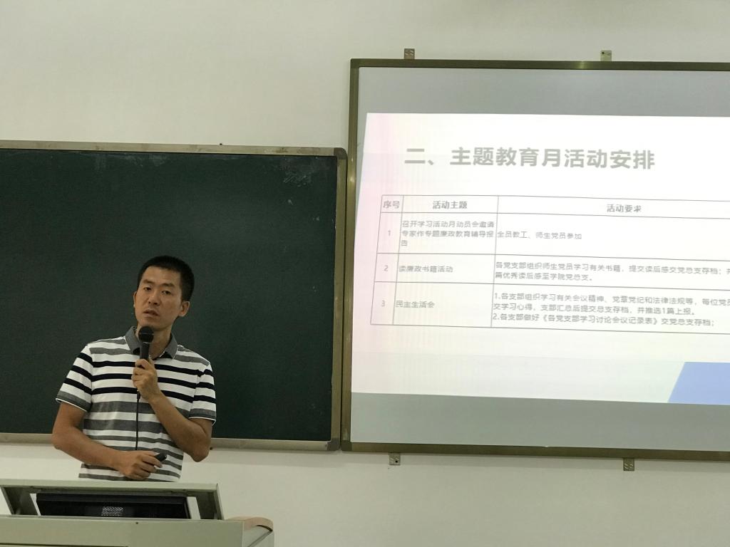 接着,钟建坤院长对加强师风师德建设的重要性进行强调,并提出两点要求:一是深化认识、提高站位,教师、党员们的言行具有示范引领作用,活动中应沉下来、学进去,不正当言论将会引起不良社会影响甚至造成舆论危机,为同学们做出错误示范,大家要在教育实践中不断提高师德水平,为同学们树立起优秀学习榜样;二是牢记要求、履行本职,大家要保质保量按要求完成各项任务,教师们要兢兢业业,做好教书育人的本职工作,学生党员要做好师生的桥梁,引领并服务好同学。