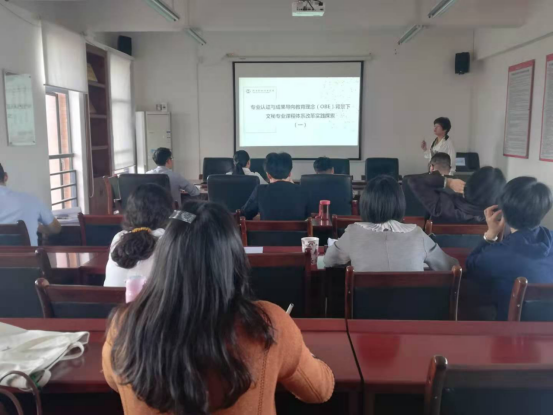 为全面提升学院各专业在课程改革和建设方面的能力, 11月16日,人文学院在院务会后,邀请文秘专业主任兼带头人韩开绯教授为全体人员作专业论证和成果导向教育理念(OBE)专题辅导。