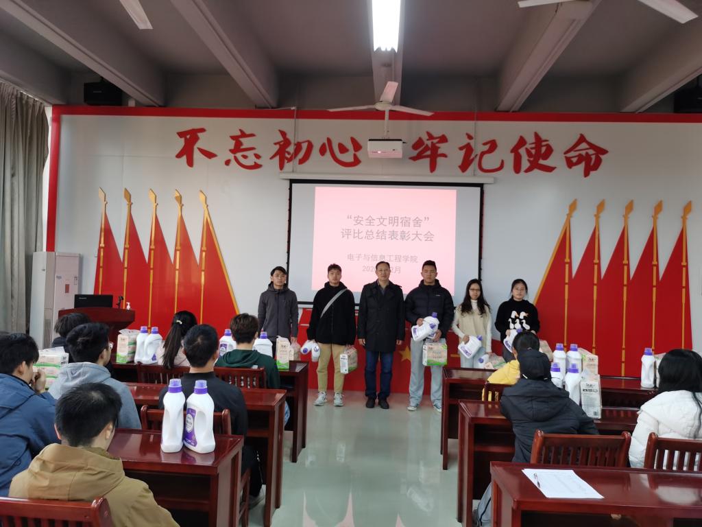 12月30日,电子与信息工程学院在实训楼B306召开“安全文明宿舍”评比总结表彰大会,学院王富宽院长、徐国辉副书记、全体辅导员与获奖宿舍代表出席本次大会。