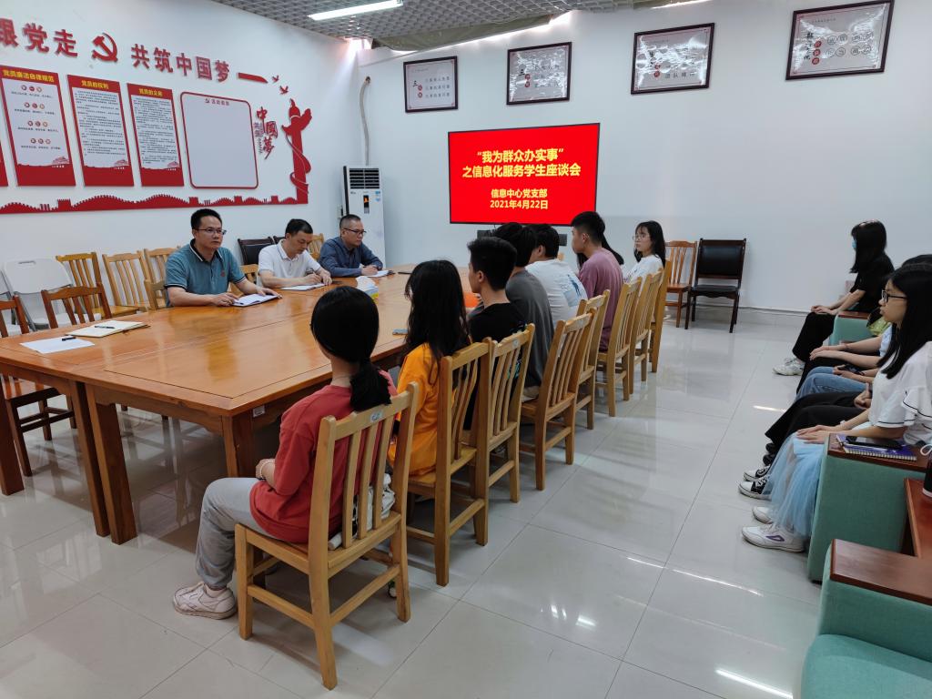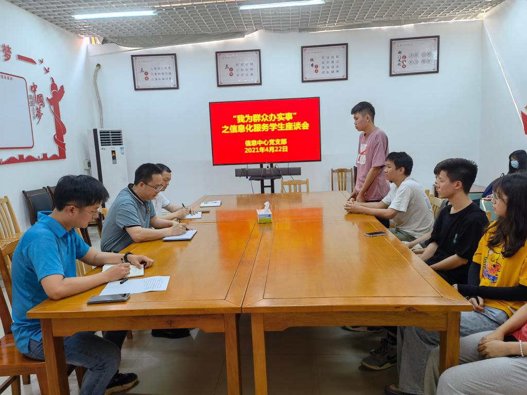 4月22日,信息中心党支部在中心会议室召开“我为群众办实事”之信息化服务学生座谈会。支部书记杨文同志、组织委员黄科同志,相关工作人员及学生代表20多人参加此次座谈会。此次座谈会旨在听取学生关于信息化服务工作的意见和建议。