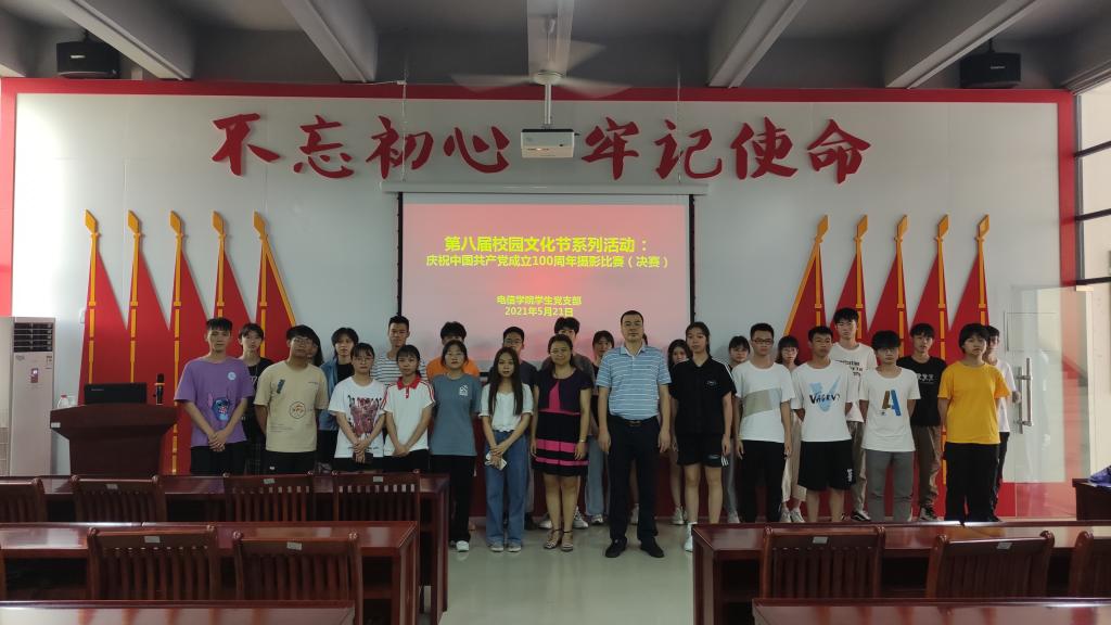 2021年5月21日,电信学院学生党支部在实训楼B306举行第八届校园文化节系列活动:庆祝中国共产党成立100周年摄影比赛(决赛),以习近平新时代中国特色社会主义思想为指导,贯彻落实习近平总书记关于青年工作的重要思想和习近平总书记在看望政协委员时关于教育工作的重要讲话精神,引导青年大学生增强“四个意识”、坚定“四个自信”、做到“两个维护”,全面推进学风建设活动,促进和谐校园文化建设,全面提高学生综合素质,为学生搭建一个提高素质、展现自我、飞扬青春和激情的舞台,以“庆祝中国共产党成立100周年”为主题开展摄影比赛活动,充分展示河职院人“厚德 强技 奋发 敬业”的校训精神。