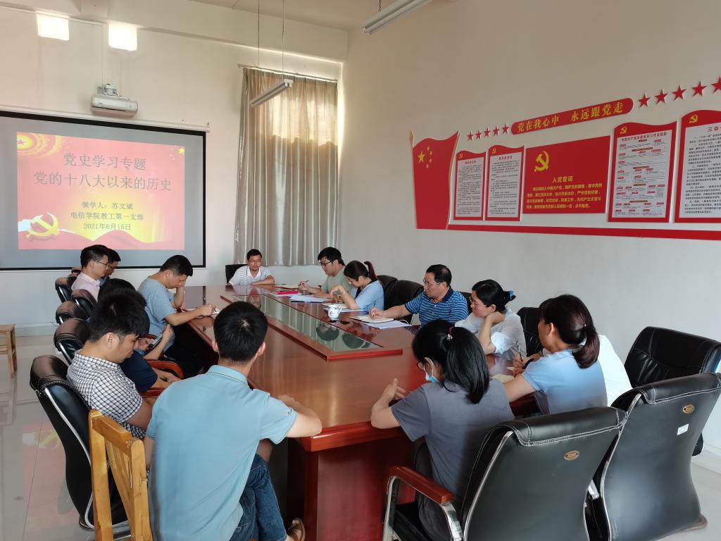 2021年6月15日下午,电信学院教工第一支部在电信学院B307开展了党史学习教育专题之党的十八大以来的历史,参加人员有教工第一支部全体成员,党支部书记高燕主持。