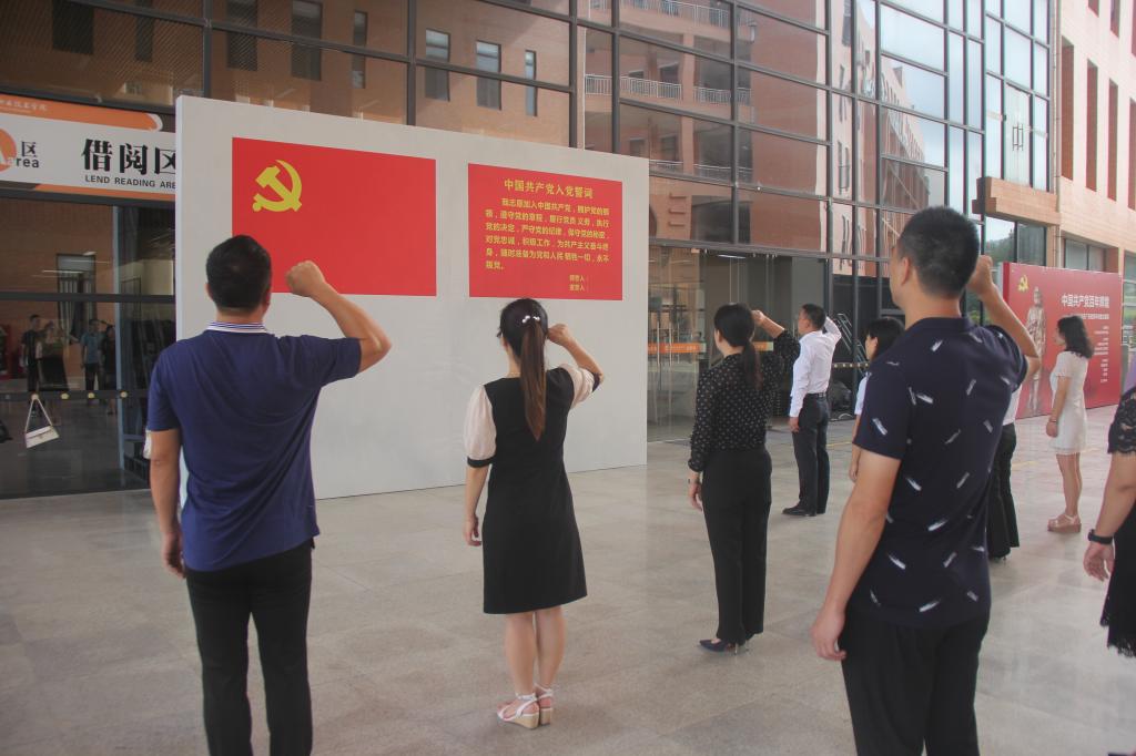 24日,全体党员在图书馆中庭开展进行了重温入党誓词的活动。党员们在鲜红的党旗面前,再次举起右手,庄重地进行入党宣誓。