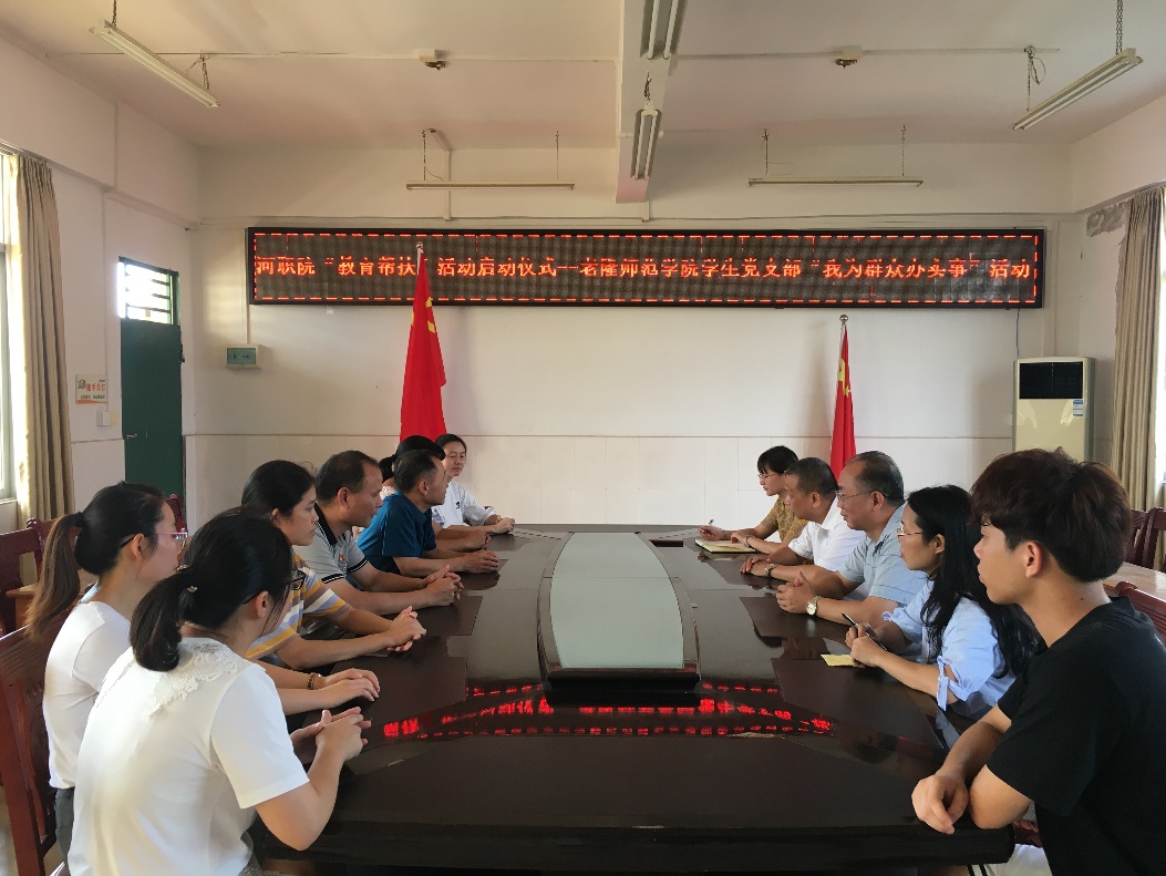老隆师范学院学生党支部积极开展“我为群众办实事”活动,9月17日下午,在河源市源城区胜利小学参加“教育帮扶”启动仪式,我院副书记谢战锋,校企办主任骆力等老师参加,胜利小学王伟强校长以及小学教师代表参加了此次活动,会议由胜利小学王校长主持。