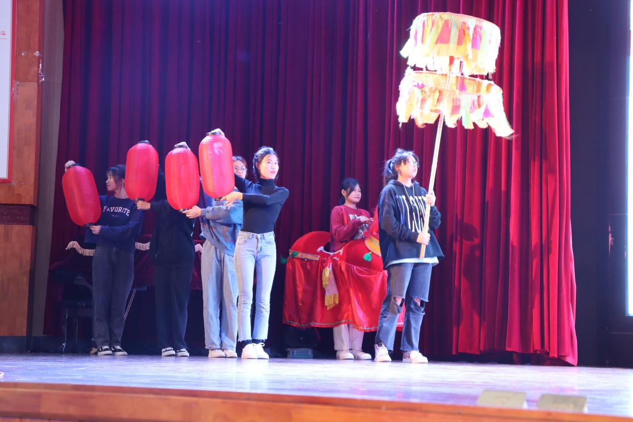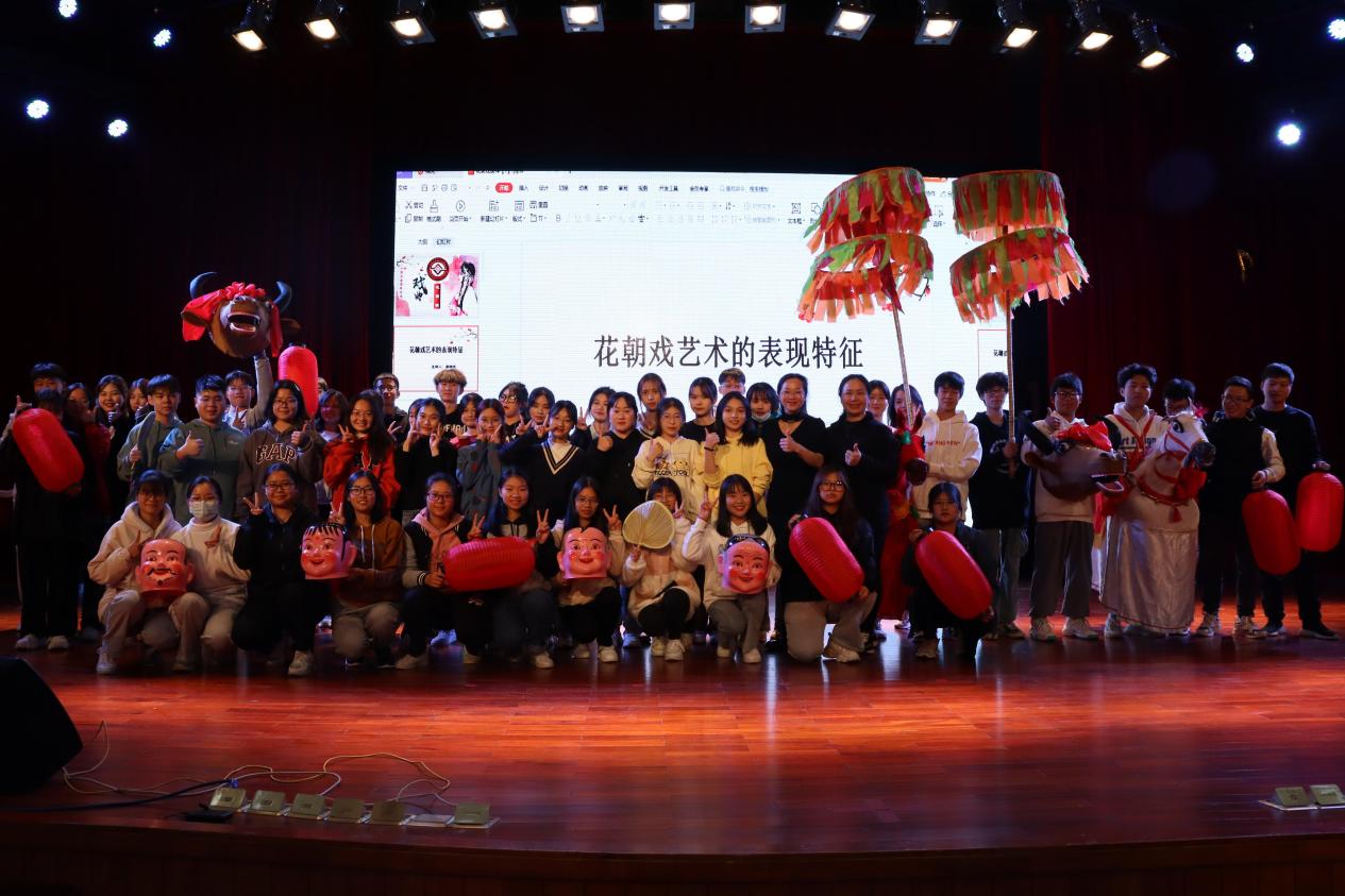 为了扩展大学生的知识面,丰富大学生的课余生活;11月11日晚上,我校美育中心在艺术楼演播厅开展了关于了解花朝戏艺术知识讲座。由紫金花朝戏传承发展中心的廖瑞枚老师主讲。参会人员有工商管理学院和人文艺术学院的学生代表各150人。讲座伊始,廖瑞枚老师向同学们讲述了神朝的形态、花朝戏的形成及她发展至今的现状。接着介绍了花朝戏的一些个性特点,比如:语言,花朝戏是用客家方言去说、唱的;还有她独特的一些表演动作,扇花、龙勾脚、穿心手等等。最后主要讲述了花朝戏艺术的三大主要特征:虚拟性、程式性、综合性。例举了花朝戏《梁祝》、《血田英魂》等剧目选段来解说三大特征的表现。随后,廖老师还带领台下的同学们上台学习花朝戏的一些程式动作,让同学们亲身体验、感受戏曲独特的美。整个舞台顿时充满欢快的气息。最后,我校花朝戏传习班的同学们以歌舞的形式为同学们带来了精彩的花朝戏表演,讲座在热烈的掌声中谢幕。据悉,花朝戏艺术在2006年就被国务院列入首批国家级非物质文化遗产名录中,本次讲座旨在更好的让学生了解花朝戏艺术,使非遗文化更好地传承发展下去。