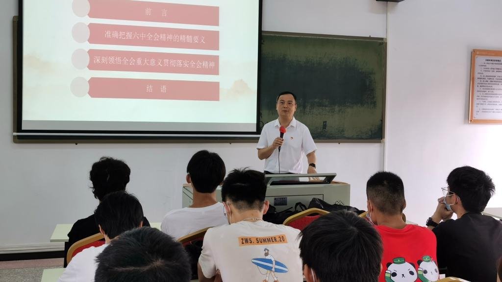 课上,钟建坤从深刻认识党的十九届六中全会的历史地位和时代背景、深刻领会十九届六中全会精神的精髓要义以及党的“四个意识”、“四个自信”、“三次理论飞跃”等内容,帮助同学们更加深入地学习领会、贯彻落实党的十九届六中全会精神,并希望作为新时代的大学生,要以党的重大成就和历史经验鼓舞斗志,积极投身于社会主义现代化建设当中,在新时代的征程中为实现中华民族伟大复兴的中国梦共同奋斗。