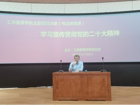 11月1日下午,工商管理学院党总支组织全院教职工在学术交流中心一楼3D导游实训室开展主题党日活动,专题学习党的二十大精神。活动以“书记讲党课”的形式开展,由学院党总支书记俞彤主讲。