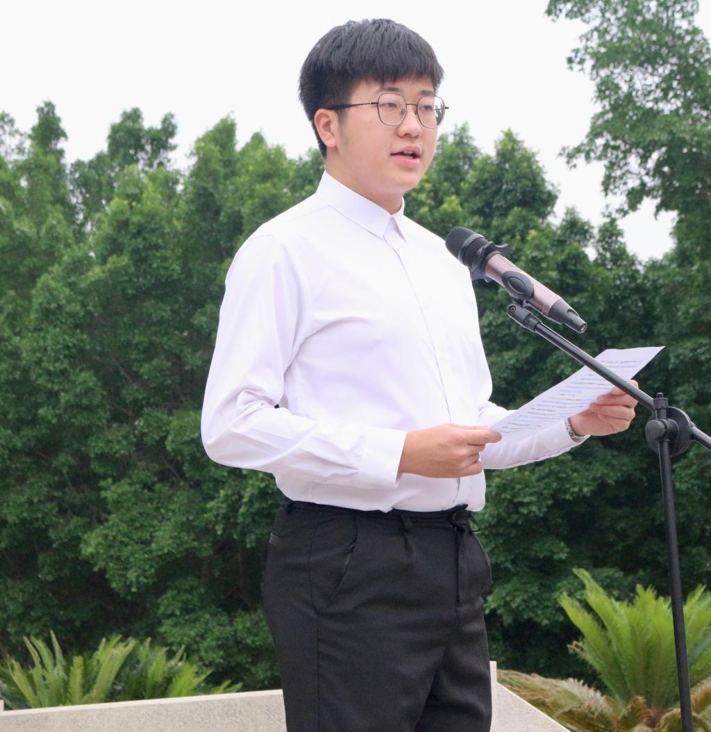 学院团委学生副书记21高分子材料智能制造技术1班曾俊杰作为学生代表发言,他表示,作为大学生应做到读万卷书,行万里路,将理论知识与实践紧密结合,积极参加团学组织与各类社团协会、各类比赛、志愿活动、寒暑假的“三下乡”活动,做到学以致用、知行相一,完善品格、提升个人综合素质。