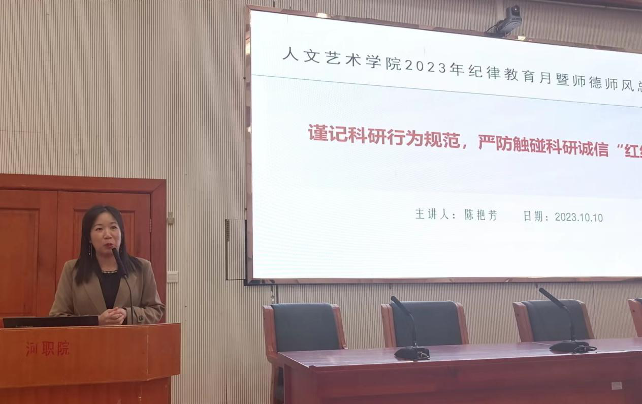 随后,学校科研处办公室主任陈艳芳教授为我院全体教职工做了题为“谨记科研行为规范,严防触碰科研诚信红线”的专题讲座。陈艳芳教授从科学精神与科学道德、科研诚信与学术不端、规范科研经费使用、双高校建设等四个方面进行讲述,告诫全体教职工一定要坚守科学精神和科学道德,严守科研底线、不触碰科研诚信红线,同时对学校科研经费的规范使用进行了详细的解读,增强了教职工科研经费使用的规则意识。