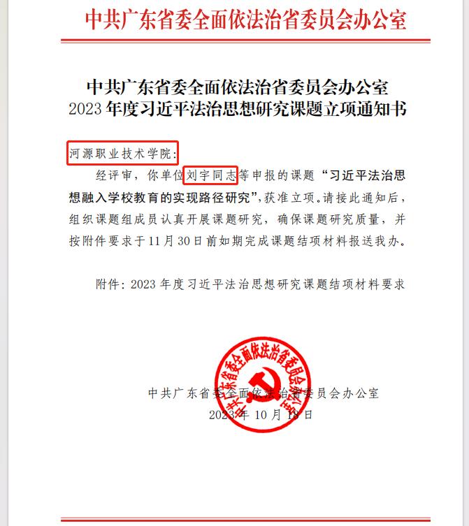 近日,中共广东省委全面依法治省委员会办公室公布了“2023年习近平法治思想研究课题立项通知书”,我校马克思主义学院院长刘宇教授主持,徐微、郭慕卿等参与申报的课题“习近平法治思想融入学校教育的实现路径研究”获得立项。
