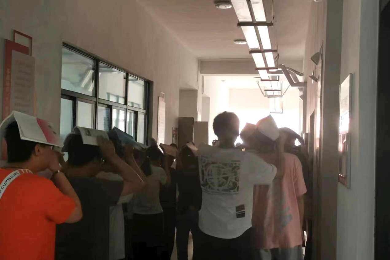随后,进行了消防安全应急演练,随着实训楼急促的演练报警声的响起,分散在各楼上课的学生在老师的指挥下迅速用手掩住嘴巴和鼻子,按指定路线有序疏散撤离到学院一楼广场。