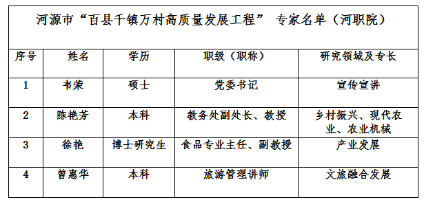 为全面加强对河源县镇村高质量发展的智力支撑,我市启动河源市“百县千镇万村高质量发展工程”专家推荐工作,通过各县(区)及市有关单位推荐、市“百千万工程”指挥部办公室审核,经市 “百千万工程”指挥部同意,我校4人入选河源市“百县千镇万村高质量发展工程”专家(名单附下)。