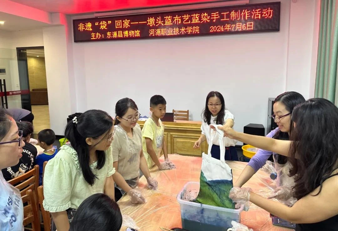 为弘扬客家文化,促进人文社科普及,传承非物质文化遗产,发挥继续教育实践教学基地育人功能,7月6日,我校联合东源县博物馆举办墩头蓝布艺蓝染讲座与实践教学公益活动。