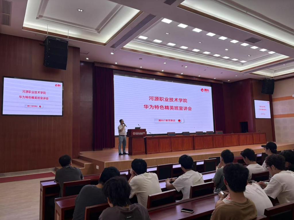 广州腾科网络技术有限公司罗经理随后为各位同学详细介绍了华为特色精英班的班级设置,她从企业实力、学习内容、就业服务和选拔方式等方面进行深入讲解。