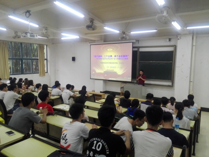 讲座上,邹建辉老师从中国社会的现状到广东省的现状,从全国人均GDP到广东省人均GDP,逐渐带领进入主题;并围绕“四个坚持”、“三个支撑”、“两个走在前列”在新的历史起点上,强调广东改革发展的旗帜、方向和原则被再次明确。要求在场的老师及学生要认真学习习近平总书记重要批示精神,让我们更加明确广东发展的优势和前进的方向。邹建辉老师分析了电信学院近期的学风情况,同时要求同学们要有上进心,积极参加各类比赛,丰富自己的大学生活。最后,徐国辉副书记对此次讲座进行总结,并给予了在座同学们宝贵的建议。