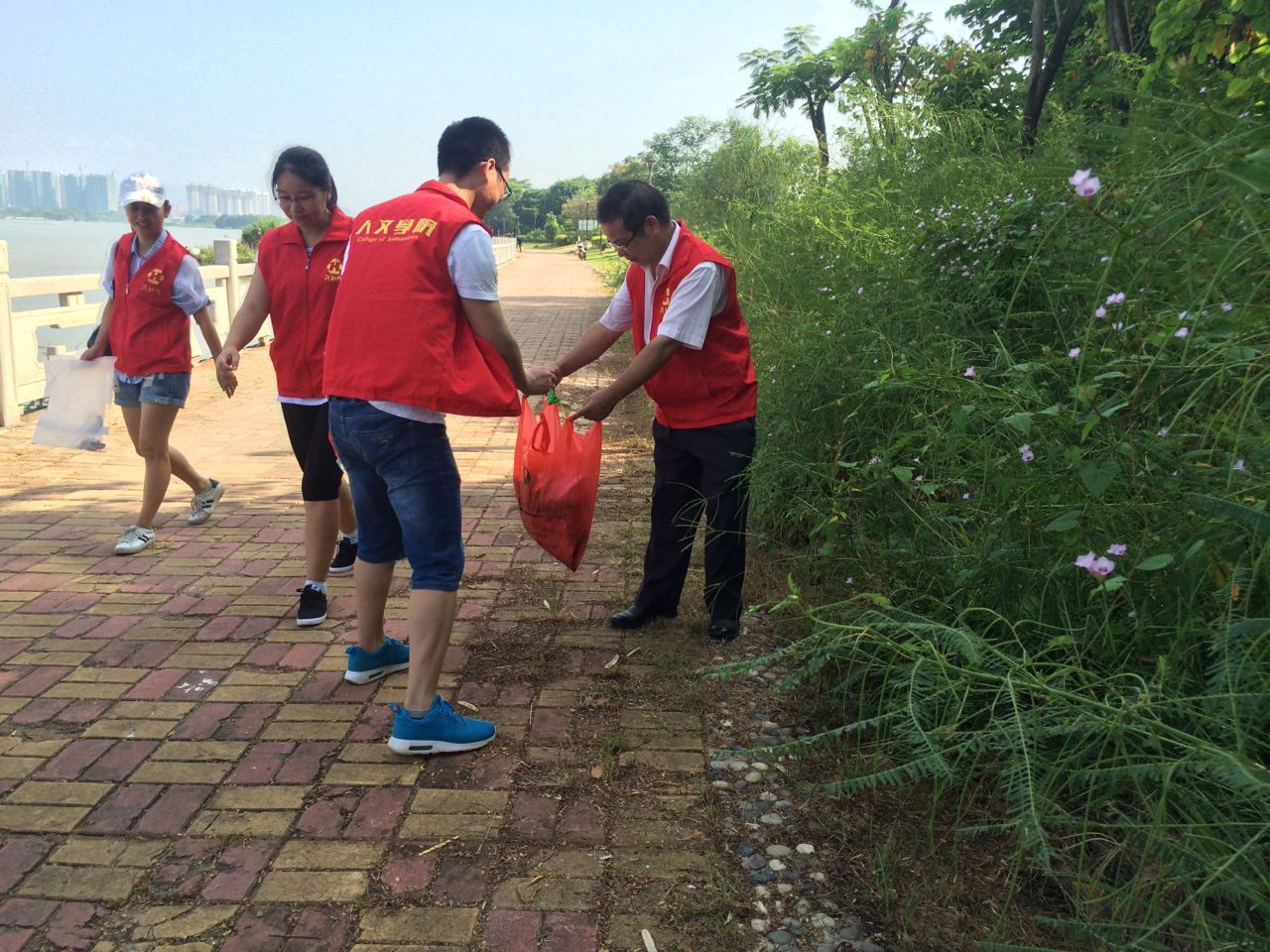 23日上午8点30分,人文学院教工第三党支部于学校西门门口集合,在西门东江步道及草坪开展环保志愿活动,本次志愿活动共16名党员同志参加,平均服务时长约100分钟。参与活动的队员们将沿江路上的烟头、塑料袋、塑料瓶等垃圾,捡起放入附近的垃圾桶中,用实际行动宣传环保。