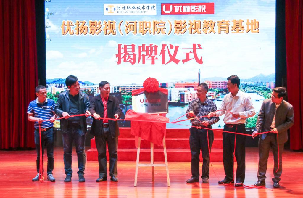 3月28日上午,“优扬影视(河职院)影视教育基地”揭牌成立仪式在艺术演播厅隆重举行。河源市优扬影视传媒有限公司(下简称:优扬影视)叶泉董事长、洪燕总经理以及公司相关人员,河源市文联副主席邹国忠先生、原河源市体育局局长古水桂先生、原河源市电视台副台长车济民先生、相关企业领导,以及我校电信学院、继续教育学院师生代表出席了仪式。