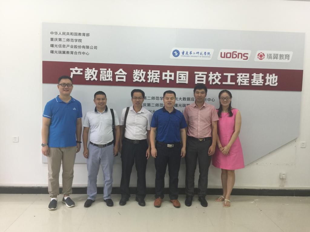 7月4日,电信学院周永福副院长率大数据技术与应用专业部分教师赴重庆第二师范学院交流学习,受到了数学与信息工程学韦鹏程院长等相关领导的热情接待,与会人员主要围绕大数据技术专业发展方向、课程建设、校企合作、大数据创新中心等进行了交流讨论。同时,参观了由中科曙光合作共建的“产教融合、数据中国百校工程基地”。中科曙光公司的古经理对整个工程基地的建设和校企共建的合作模式进行了详细的介绍。