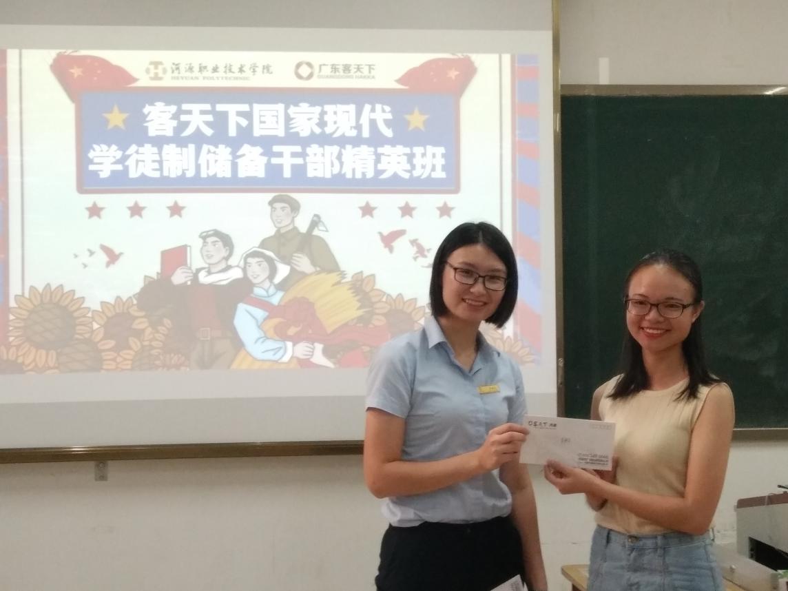 9月21日,客天下梁晴苑经理率队带着23份录取通知书和中秋节礼物来到河职院,宣布河职院·客天下国家现代学徒制储备干部精英班(第一期)学员名单,为每一位同学发放录取通知书、明信片(景区实景图,寄中秋贺卡回家)。