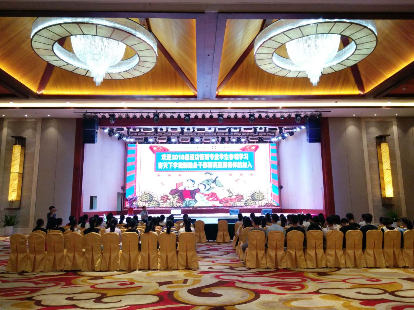 酒店管理专业曾惠华主任进行专业介绍,黄蔚红老师给予新生寄语;客天下综管部人事经理梁晴苑介绍企业蓝图及现代学徒制班招生流程; 2017届/2018届河职院酒管毕业生、客天下各部门师兄师姐经验分享。